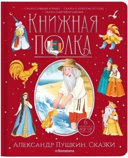 This collection features renowned fairy tales by the great Russian classic, Alexander Sergeyevich Pushkin. Stories such as "The Tale of the Fisherman and the Fish," "The Tale of the Dead Princess and the Seven Knights," and "The Tale of Tsar Saltan" (implied by "Tsar Dadon and the Shamakhan Queen") are brought to life with vibrant, three-dimensional illustrations. These visuals aim to immerse young readers in the authentic atmosphere of Russian folklore. The book is part of the "Book Shelf" series, dedicated to beloved authors.