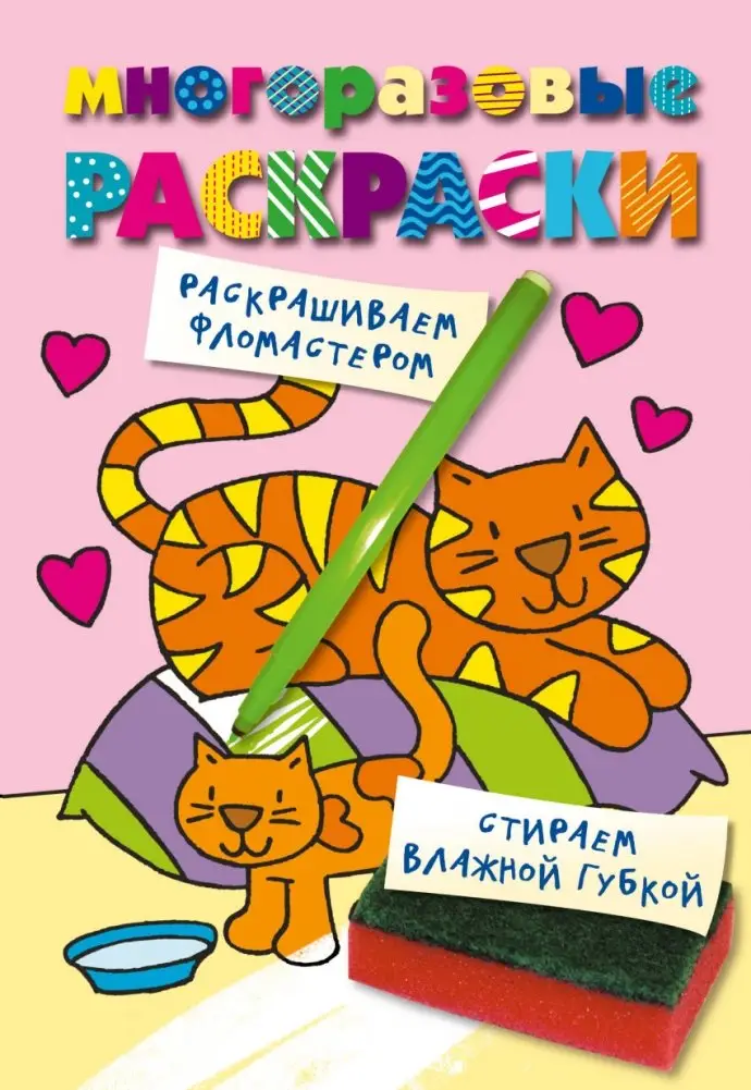 Эта многоразовая раскраска предлагает юным художникам возможность творить снова и снова. Используя фломастеры, дети могут раскрашивать забавные картинки с кошечкой. Если результат не устраивает, изображение легко очищается влажной губкой для новой попытки. Особенностью является уже цветной фон, что позволяет сосредоточить внимание ребенка на раскрашивании персонажей и деталей.