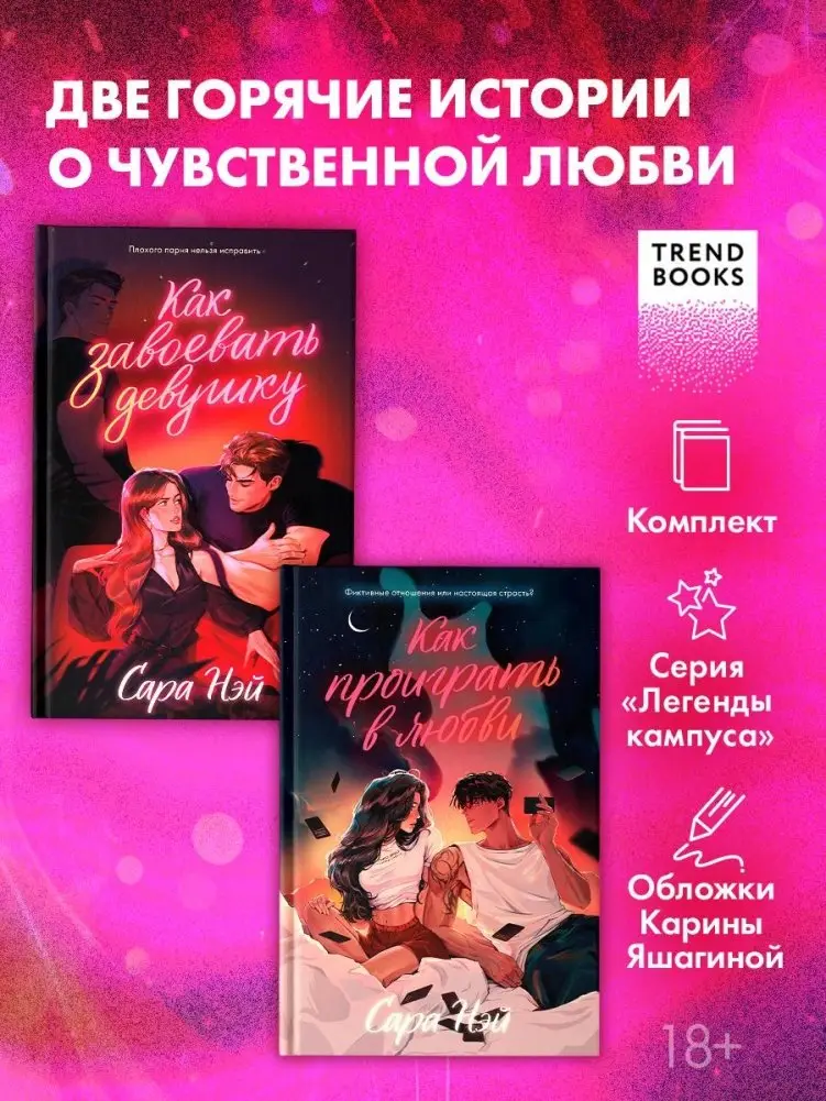 В этом комплекте две романтические новеллы от бестселлера USA Today Сары Нэй, помещённые в атмосферу университетского футбольного клуба. «Как проиграть в любви» рассказывает о Далласе Колтере, который заключает фиктивные отношения с Райан Уинтерс, но в преддверии решающего матча их чувства становятся реальными. «Как завоевать девушку» следует за Дрейком Колтером, который пытается завлечь Дейзи Беннет, притворяясь своим братом‑близнецом, и впервые задумывается о настоящих отношениях. Оба романа полны юмора, страсти и конфликтов, характерных для тропа «враги‑возлюбленные». Книги предназначены для взрослых читателей (18+) и входят в серию Trendbooks «Легенды кампуса».